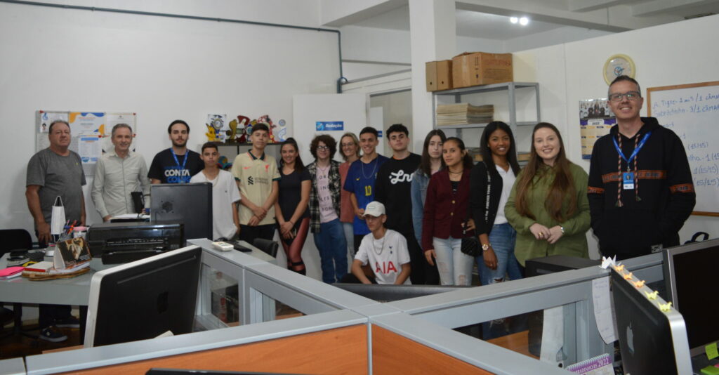 Alunos representantes das turmas em visita à redação do jornal Gazeta da Serra