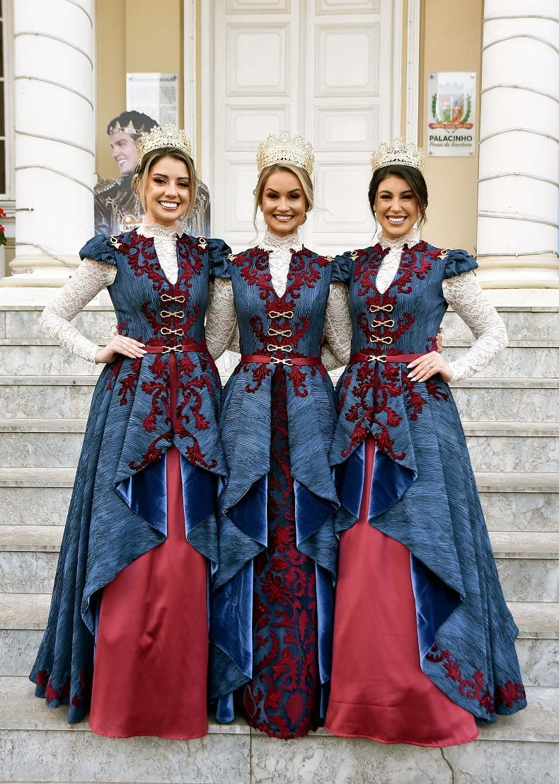 O espírito destemido dos imigrantes alemães que há 200 anos encararam o mar em uma jornada incerta em busca de um novo lar está estampado nos trajes do trio de soberanas da 39ª Oktoberfest formado pela rainha Tatiane Caroline Voese D’Avila, e pelas princesas Karoline Ribeiro Klaus e Nathalia Konzen da Silva. Os vestidos, oficiais e de passeio, foram apresentados para a comunidade em evento realizado neste domingo, 11, na Praça da Bandeira, e trazem consigo em cada detalhe, desde as cores até os tecidos, uma viagem no tempo que retrata a coragem, a esperança e a resiliência dos antepassados.