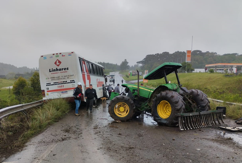 Um acidente envolvendo um ônibus e um trator foi registrado por volta de 15 horas desta terça-feira, 31, na RSC-153. A colisão aconteceu no quilômetro 280 da rodovia, na localidade de Pinhal Santo Antônio, no interior de Sinimbu, proximidades do Casarão Serrano. A Polícia Rodoviária Estadual (PRE) foi acionada e atendeu a ocorrência.