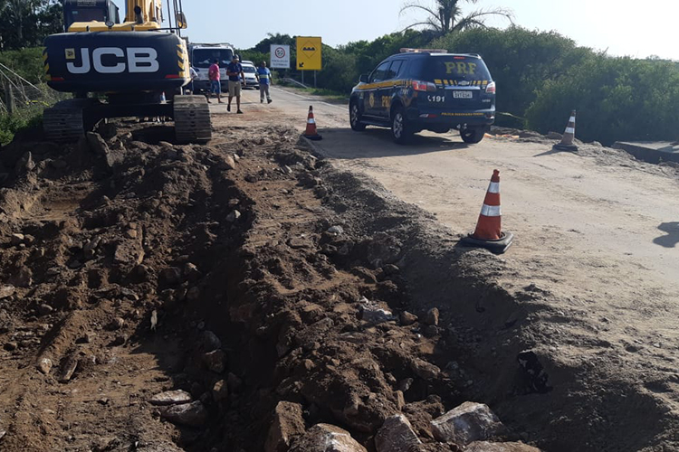Após o asfalto ceder sobre um dispositivo de drenagem da Estação Ecológica do Taim, o trânsito na BR-471, no quilômetro 537, em Rio Grande, está em meia pista nesta segunda-feira, 27. A medida vale para todos os veículos. Equipes do Departamento Nacional de Infraestrutura de Transportes (Dnit) trabalham no local para permitir a liberação total da rodovia. Apesar da mobilização, ainda não há previsão de quando o trânsito volta o normal.