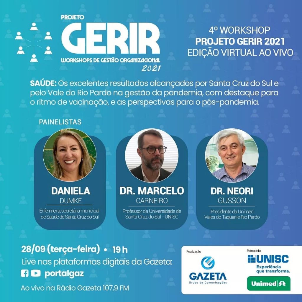 O cenário local e regional na área da Saúde, num contexto de pandemia e de forte avanço registrado na vacinação contra a Covid-19, será o tema da quarta edição do Projeto Gerir – Workshop de Gestão Organizacional 2021, iniciativa da Gazeta Grupo de Comunicações. O evento ocorrerá na próxima terça-feira, dia 28, a partir das 19 horas, e marca, desse modo, a passagem dos 143 anos de emancipação de Santa Cruz do Sul, a serem comemorados naquela data.
