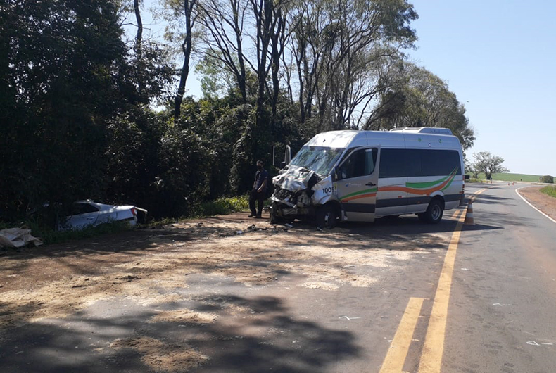 A colisão envolveu um Jetta e uma van Sprinter. O condutor e o passageiro do carro morreram. Já os 13 integrantes da van foram socorridos.