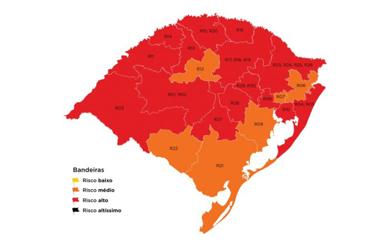 Em bandeira laranja estão as regiões de Guaíba, que se classificou como risco médio pela segunda semana consecutiva, Taquara, Novo Hamburgo, Cruz Alta, Pelotas e Bagé.
