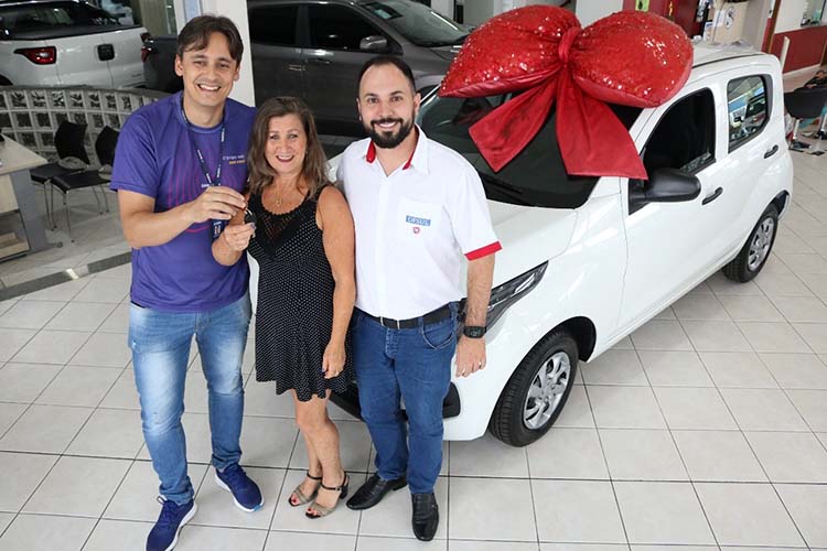 A Gazeta FM 101.7 entregou oficialmente na tarde dessa quinta-feira o carro Fiat Mobi zero-quilômetro para a ganhadora da promoção que marcou os 35 anos da emissora. A aposentada Ires Costa, de 59 anos, recebeu as chaves de seu veículo do gerente da rádio, Rafael Silveira, e do vendedor Kaciandro Brum Sperling na concessionária DFSul Fiat, em Santa Cruz do Sul. O sorteio aconteceu na noite do último domingo, 16, durante a programação natalina do Parque Europa.