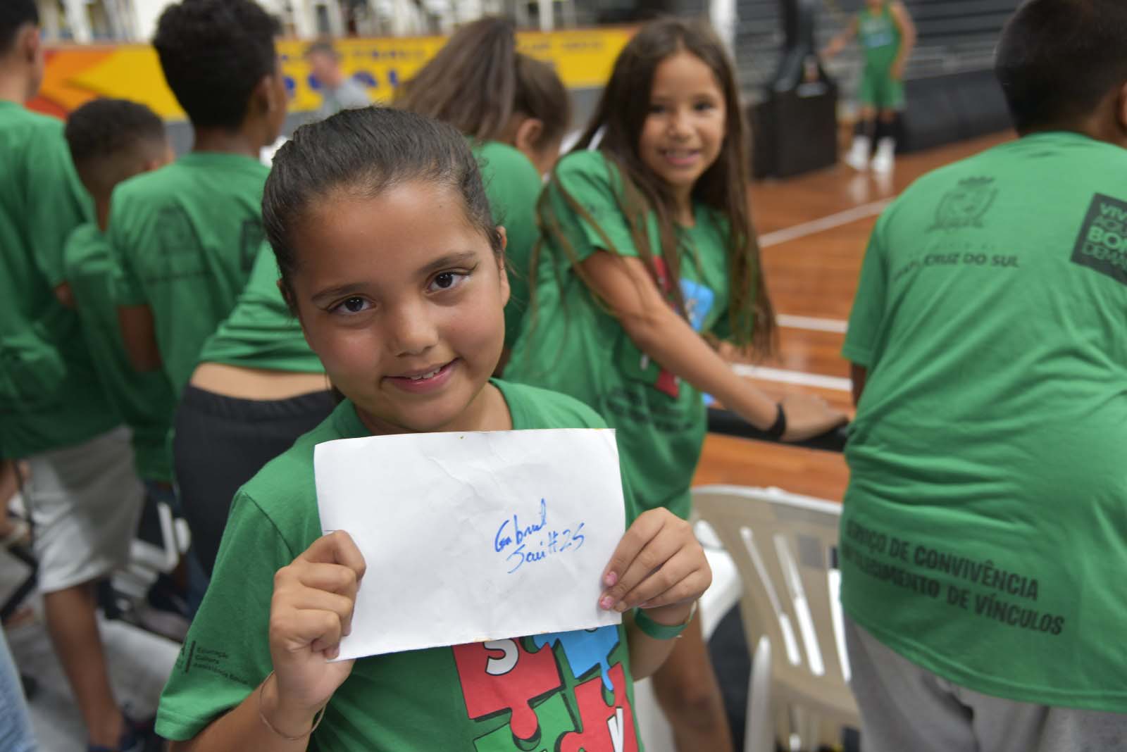 Moradora do Bairro Santa Vitória, ela ganhou até autógrafo do atleta Gabriel Jaú, e saiu exibindo o bilhete para os colegas. Frequentadora dos projetos no Cras Beatriz Jungblut, ela e outras 25 crianças puderam assistir ao treino. Em um dos momentos, posaram para foto com o jogador Lucas Mariano. O público teve a oportunidade de acompanhar o treinamento realizando a doação de um quilo de alimento não perecível.