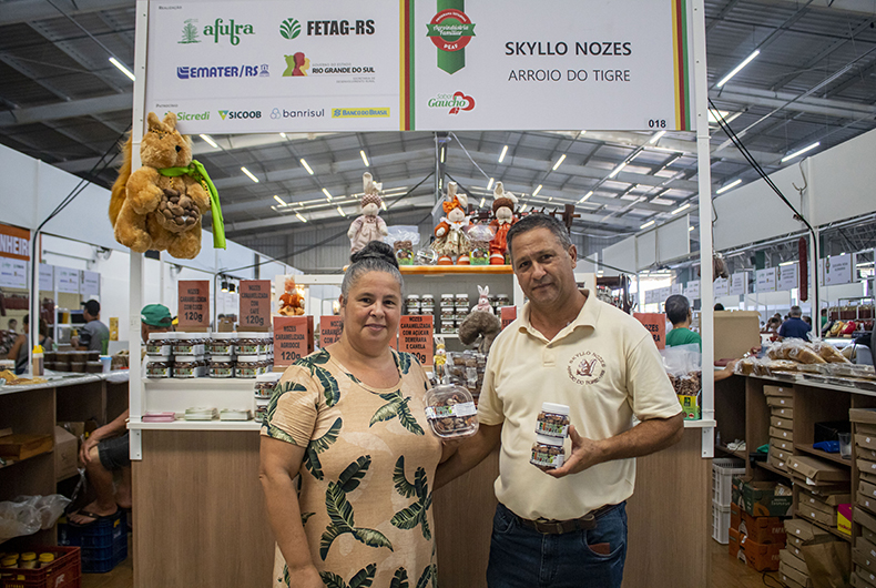 Uma das atrações fica por conta dos produtos à base de noz-pecã. Os expositores Vera Lúcia Bilhan, 52 anos, e Rogério Bilhan, 56, são de Arroio do Tigre e aproveitam para divulgar sua atividade. “Há 20 anos iniciamos com dois pés de noz-pecã. Na época, não sabíamos que podia dar dinheiro. Passamos a investir na produção, vendendo inicialmente noz com casca e depois sem casca”, contou Vera. A ampliação da oferta de produtos é mais recente. “Nossa primeira feira foi na Expointer, em 2021. Passamos a vender biscoitos de nozes, nozes caramelizadas e outros tipos. Tudo é feito na nossa empresa, em Arroio do Tigre.”