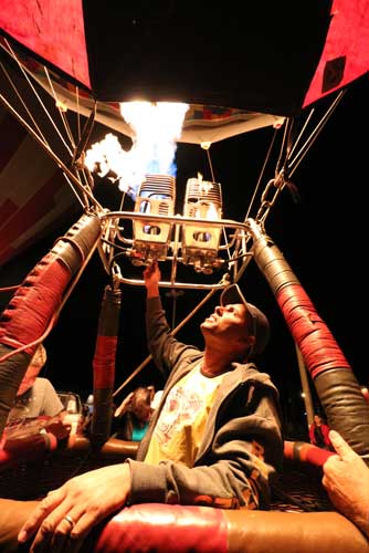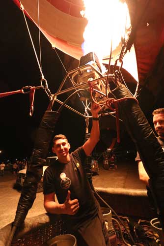 – Atingido o tamanho ideal, são desligadas as ventoinhas e começa o aquecimento do ar com o maçarico, até que o balão fique em pé.