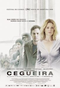 Ensaio sobre a Cegueira. Assisti a esse filme de Fernando Meirelles no cinema, se não estou enganada, em 2009. O roteiro é baseado no livro, do mesmo título, de José Saramago (fica também a dica do livro). Na trama, uma epidemia de cegueira branca gera colapso na sociedade. O governo coloca os primeiros atingidos em abrigo, em quarentena, mas com o passar do tempo, todos são contaminados. Soa familiar?