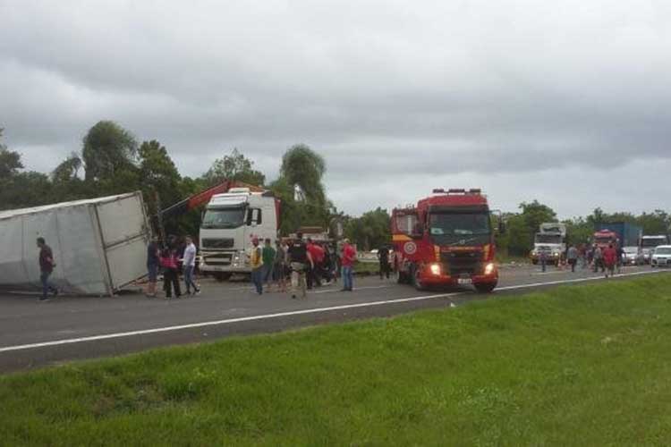 Conforme a Polícia Rodoviária Federal (PRF), um caminhão que prestava serviço recolhendo resíduos nas lixeiras de concreto às margens da rodovia foi atingido por um caminhão baú carregado de ração, ambos trafegando pela faixa da direita.