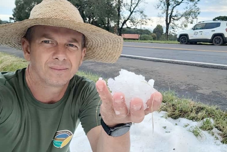 Em direção ao município de Imbituva, no Paraná, mais de 400 quilômetros de onde estávamos, sete horas de viagem, nos deparamos com um visitante indesejado, o granizo. Nesse meio-tempo, começamos a receber fotos e vídeos da região, onde o temporal atingia algumas cidades, e víamos nuvens carregadas na estrada. Para nosso desprazer, encontramos granizo no caminho. No município de Guará, nos deparamos com enorme quantidade de granizo acumulado no quilômetro 321 da BR-277. A gente fez o registro com foto, nossa camionete ao fundo. Sabemos que nas lavouras também houve acúmulo e prejuízos, lamentavelmente. Nesta manhã vamos para São Mateus e, à tarde, Palmeira.