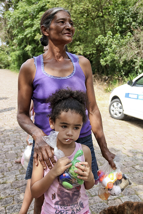 “É muito importante eles olharem para nós.” A declaração de dona Nelícia Amabília, de 53 anos, revela a emoção que sentiu no último sábado, 17. Ela tirou a tarde de folga, em que trabalharia colhendo tabaco em lavouras de Cerro Alegre, para buscar um presente para as seis netas no Bairro Margarida. Assim como ela, no local improvisado na calçada de uma residência, dezenas de pessoas compareceram para receber um cachorro-quente, um brinquedo e também o sorriso dos integrantes do Grupo do Bem.