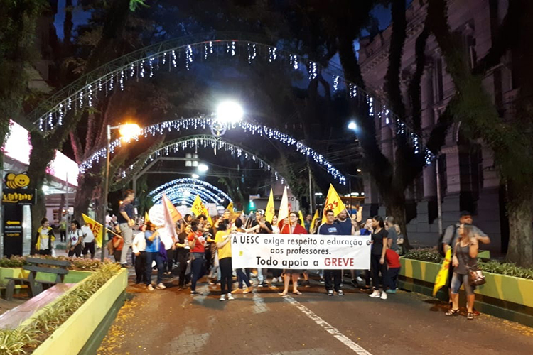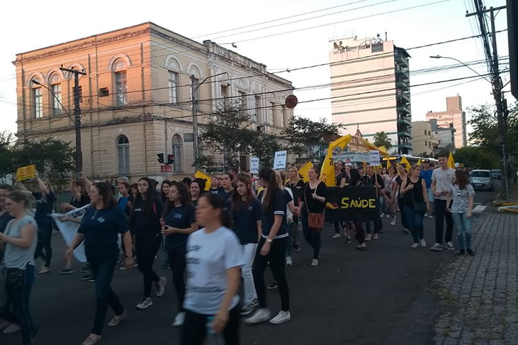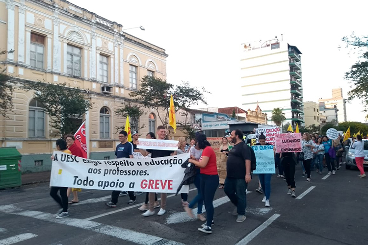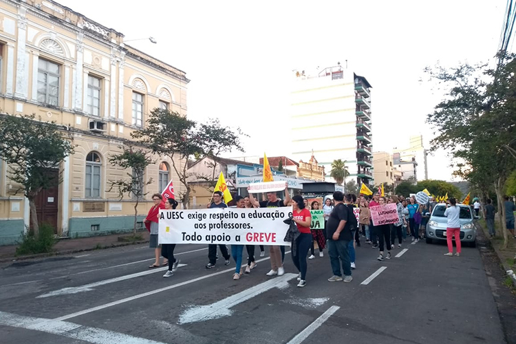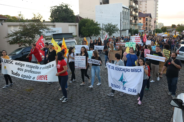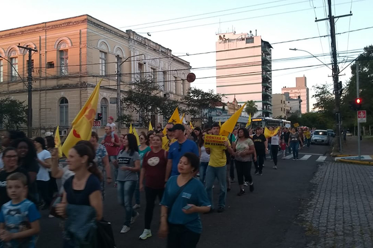 Pelo trajeto, da Escola Ernesto Alves até a Praça da Bandeira, o grupo relembrou a assembleia, também histórica, realizada na terça-feira em Porto Alegre. Lá, na Praça da Matriz, cerca de 20 mil pessoas participaram da mobilização contra o pacote para o funcionalismo, apresentado pelo governador Eduardo Leite. “Foi ele quem começou a greve, não fomos nós”, disse o professor de Língua Portuguesa Felipe Kopp, ao lado dos colegas de profissão. “Essa greve não é só pelo salário atrasado e defasado. É pelo futuro da educação e de todos.” E a mobilização continua nesta quinta-feira, 28, com uma caminhada luminosa a partir das 18 horas, na passarela do Arroio Grande, e às 19h15, do Colégio Luiz Dourado à Escola Santa Cruz.