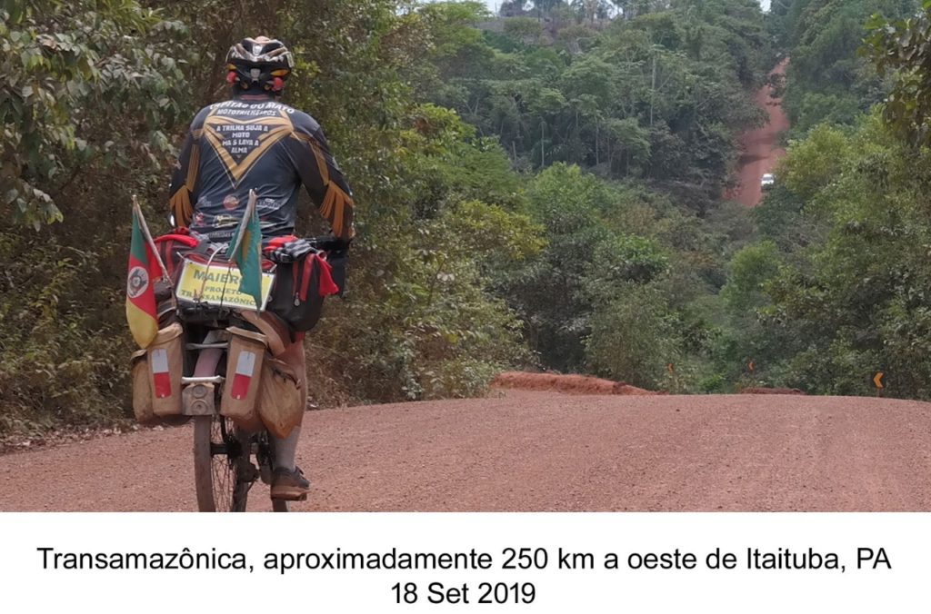 O pior trecho está entre Jacareacanga e Itaituba, um verdadeiro suplício, onde caminhões carregados não conseguem vencer as ribanceiras. Era impossível subir pedalando ou descer em velocidade, devido ao perigo do cascalho solto, pois o revestimento é de piçarra. Os raros trechos relativamente planos também exigem cautela. Assim, a média diária de deslocamento é muito baixa. Com uma semana dentro do Pará, começam os mal-estares, que foram se intensificando com o passar dos dias. Eu só tomaria conhecimento do motivo ao interromper a viagem e regressar a Brasília, dias depois. Duas semanas antes de chegar a Uruará, dia 2 de outubro, vivi um verdadeiro infortúnio: falta de apetite, dificuldade em evacuar, dor de cabeça, tontura, fadiga extrema, tremores, pés inchados, furúnculo nas nádegas, hemorroidas e 11 quilos a menos.