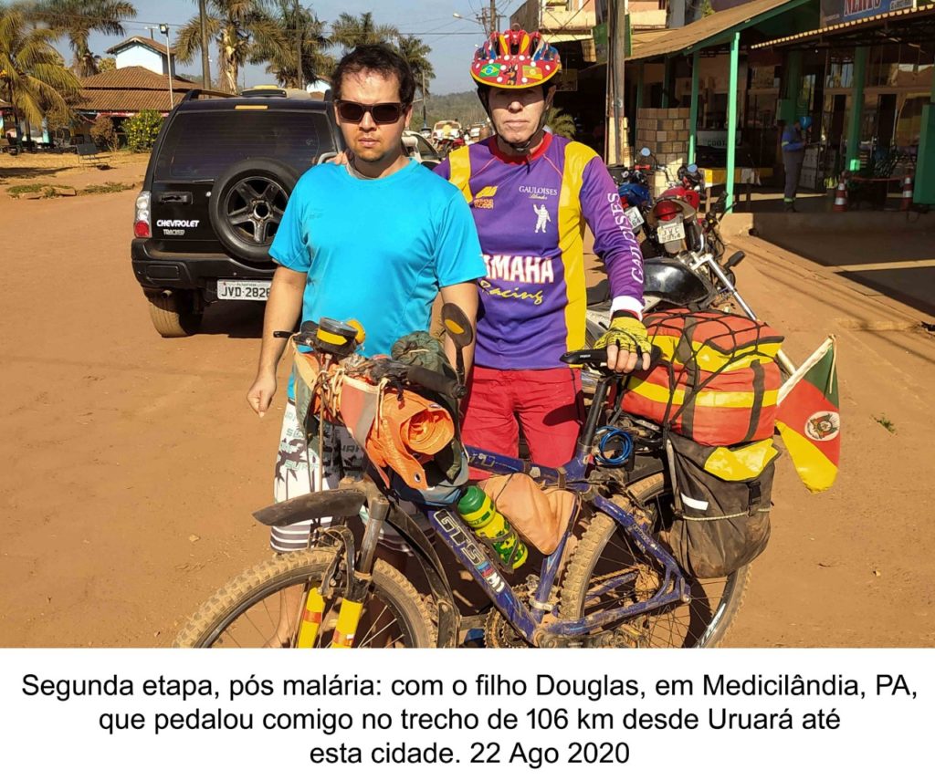 A bicicleta foi reequipada com novos alforjes, bagageiros e outros itens, desmontada e encaixotada para o voo Brasília/Santarém e para o trajeto de ônibus Santarém/Uruará (PA). No reinício da viagem ciclística, em 18 de agosto de 2020, tive a companhia do filho Douglas, que comprou em Uruará uma bicicleta para fazer o percurso de terra de 106 km até Medicilândia (PA). Daí para a frente, segui sozinho. Nessa fase, todos os pernoites foram em hotéis, pousadas ou dormitórios, ao contrário da anterior (2019), em que colchonete ou rede foram utilizados em postos de combustíveis, casas (habitadas ou abandonadas), reservas indígenas ou varandas de bares, restaurantes e comércios.