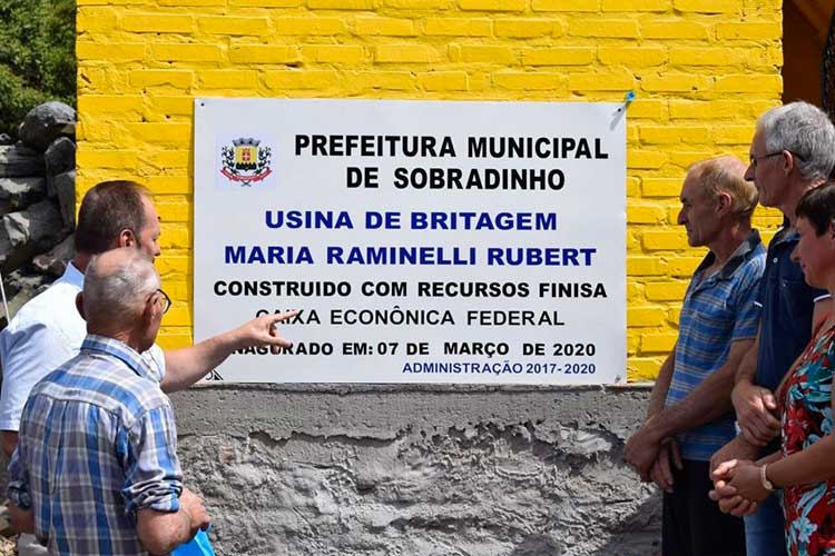 A inauguração da usina de britagem Maria Raminelli Rubert aconteceu no último sábado, 7, em Linha Herval, interior de Sobradinho. A obra recebeu um investimento de R$ 837.412,41, sendo R$ 793 mil de recursos obtidos por meio de financiamento do Finisa, da Caixa Econômica Federal, e R$ 44.412,41 de recursos próprios do município.