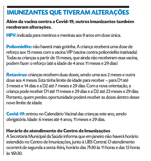 A Secretaria da Saúde de Venâncio Aires, por meio do Centro de Imunizações, divulgou informações sobre a atualização da estratégia de vacinação contra a Covid-19. As orientações foram enviadas pelo Ministério da Saúde. Entre as novidades estão a inclusão da vacina contra a doença no Calendário Nacional de Vacinação para gestantes e idosos (com 60 anos ou mais); e o esquema vacinal para crianças de seis meses a menores de 5 anos, com esquema de acordo com imunizante disponível.