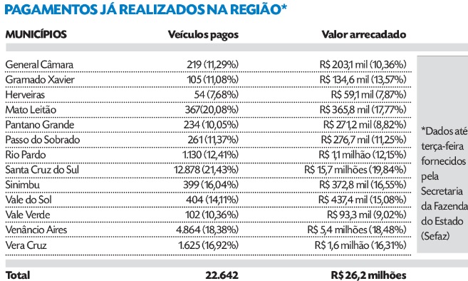 Conforme dados da Secretaria da Fazenda do Estado, até terça-feira a região já havia arrecadado mais de R$ 26 milhões com a antecipação do IPVA, em 13 municípios do Vale do Rio Pardo e Centro-Serra. O valor é repartido, automaticamente, em 50% para o Estado e 50% para o município do licenciamento do veículo. Proprietários de 22.642 veículos já estão em dia com o tributo na região. Santa Cruz do Sul lidera a arrecadação, com R$ 15,7 milhões. A segunda maior receita está em Venâncio Aires – R$ 5,42 milhões. Ainda no topo do ranking aparecem Vera Cruz (R$ 1,6 milhão); Rio Pardo (R$ 1,1 milhão) e Vale do Sol (R$ 437 mil).