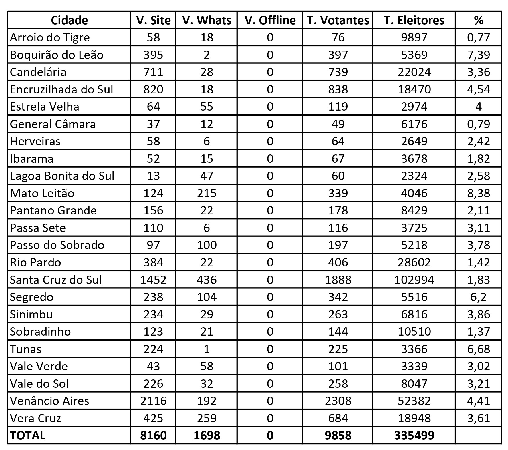 Até o meio dia desta quinta-feira, foram registrados na região 9.858 votos extra-oficialmente, sendo que seis dos 23 municípios da região ainda não alcançaram o índice mínimo: Arroio do Tigre tem 0,77%; General Câmara, 0,79; Ibarama, 1,82; Rio Pardo, 1,42; Santa Cruz do Sul, 1,83; e Sobradinho, 1,37. Como ainda são números extra-oficiais, ainda é preciso fazer o cruzamento entre os votos pelo site e por WhatsApp onde, muita vezes, podem ter mais votos. Alguns municípios também optaram pela coleta offline, que precisa ser computada após o fim do ciclo da votação.