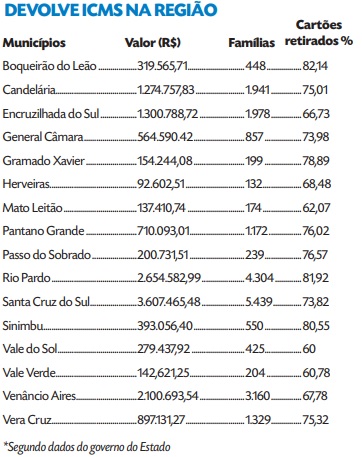 Para retirar o cartão que dá direito ao benefício, o titular precisa apresentar documento de identificação oficial com foto e número do CPF. Em Santa Cruz do Sul, a entrega é feita na agência do Banrisul, na Rua Marechal Deodoro, 391, no Centro. “É um programa de transferência de renda, a partir do consumo. E as pessoas mais pobres são, proporcionalmente, as que mais pagam impostos. São mais de 4 mil famílias cadastradas que teriam direito, o que dá em torno de 12 mil pessoas”, destaca a secretária de Desenvolvimento Social, Roberta Pereira.