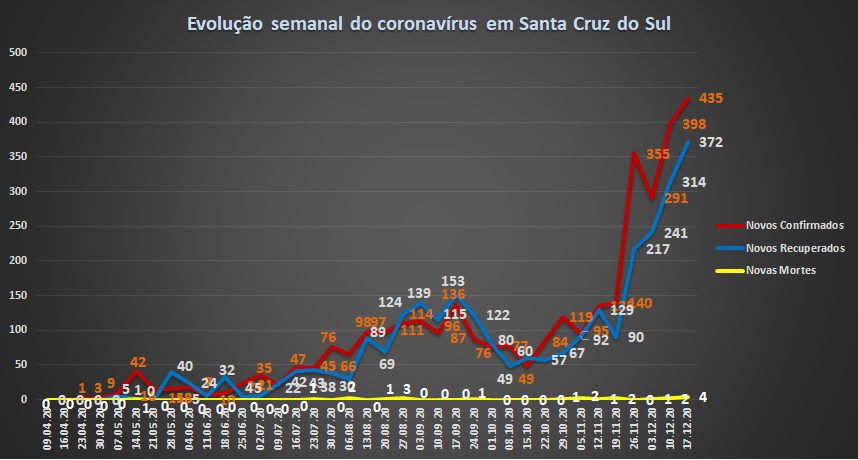 Pela quarta semana consecutiva, tanto Santa Cruz do Sul como o Vale do Rio Pardo quebraram o recorde de novas infecções pela Covid-19. Entre os dias 10 e 17 deste mês foram registrados 435 casos da doença no município, ante os 398 da semana passada. Já na região houve 873 casos, contra 776 anteriormente. Chama a atenção o fato de a pandemia seguir avançando com números expressivos mesmo após duas semanas de bandeira vermelha e restrições mais rígidas para a atividade comercial e circulação de pessoas, ao mesmo tempo em que o Natal se aproxima e essas regras foram flexibilizadas na região.