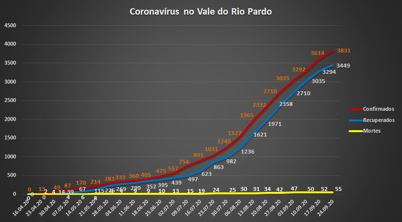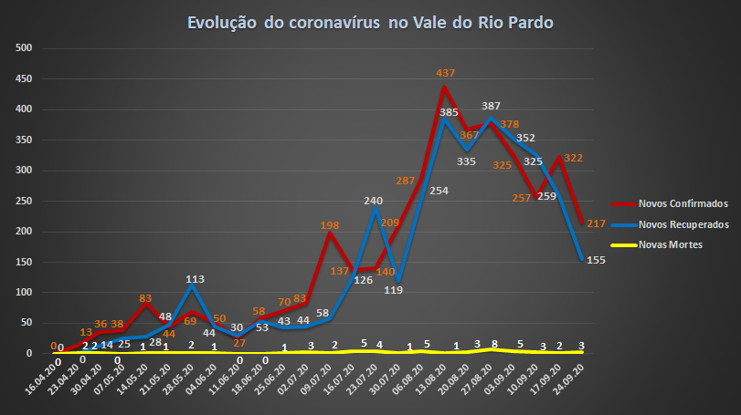 O número de recuperados cresceu em relação à semana anterior, depois de dois períodos estáveis. Foram 375 novas pessoas consideradas curadas, aumento de 12,6% sobre o total, ante os 10% das últimas duas análises. O saldo é de 158 curados a mais do que os novos casos. Ocorreram, ainda, três óbitos – em Santa Cruz do Sul, Venâncio Aires e Candelária.