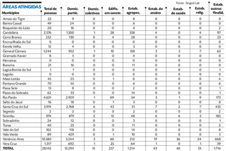 O Vale do Rio Pardo teve 28.145 pessoas dentro das áreas afetadas delimitadas pelas prefeituras, por órgãos estaduais e pelo governo federal como atingidas pelas cheias no mês de maio. O número representa 6,17% do total da população da região. Nos 28 municípios, houve 15.294 domicílios particulares afetados. As informações constam na nova área do Sistema Nacional de Geociências, Estatísticas e Dados (Singed Lab) lançada pelo Instituto Brasileiro de Geografia e Estatística (IBGE).