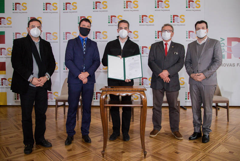 Governador Leite, secretários de Estado e parlamentares na assinatura do PLC | Foto: Felipe Dalla Valle/Palácio Piratini