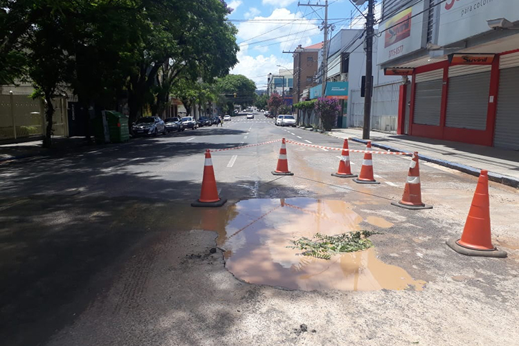 Um vazamento de água levou ao fechamento de uma das pistas da Rua Tenente Coronel Brito, na quadra entre as ruas Ramiro Barcelos e Fernando Abbot, Centro de Santa Cruz do Sul, neste sábado, 23. O local foi sinalizado com cones.