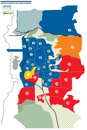 A Gazeta do Sul traçou o mapa do voto em Santa Cruz, com base nos resultados de cada seção. O levantamento leva em consideração a localização das urnas, não o local de residência dos eleitores.
