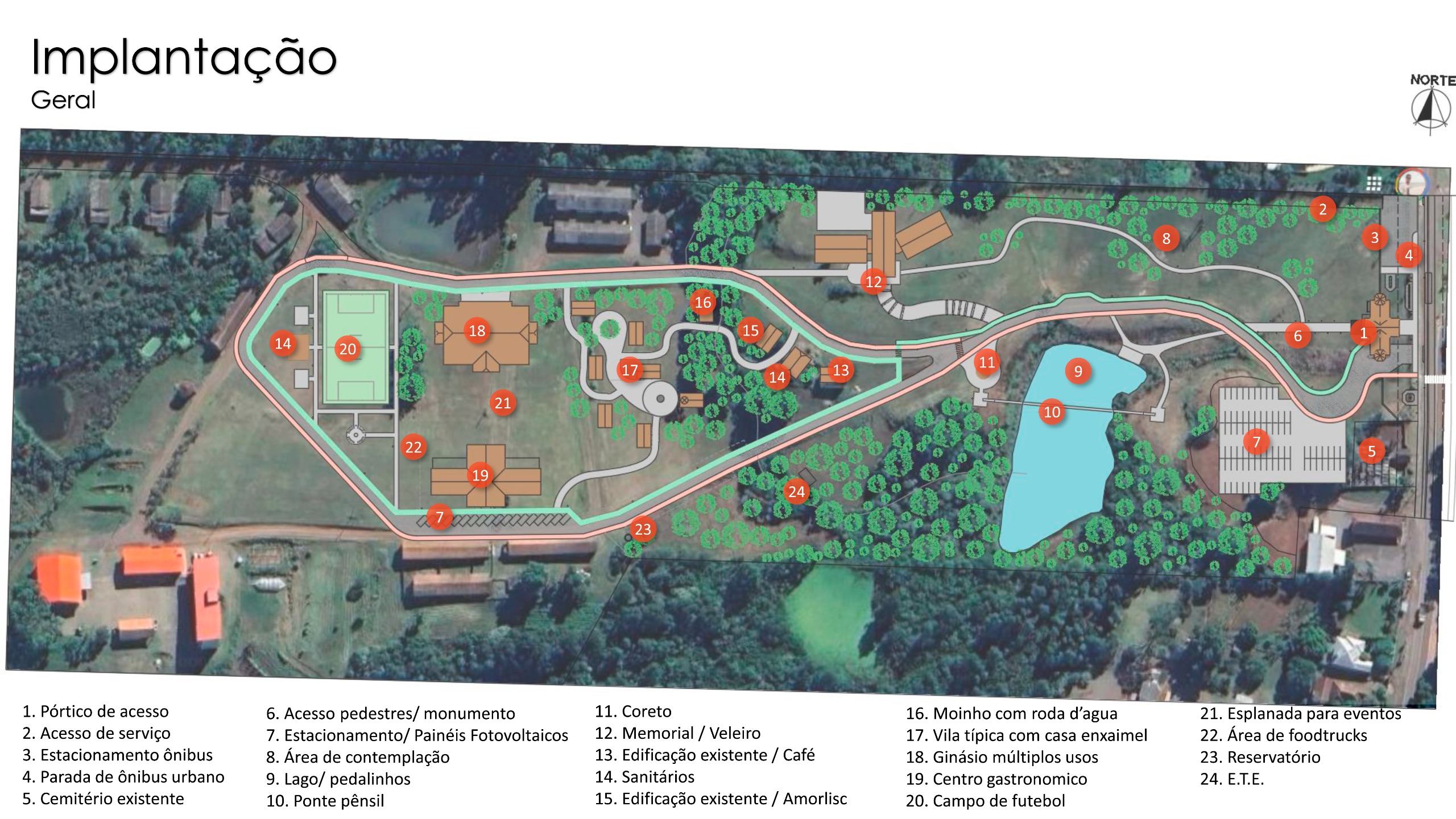 Também está prevista a instalação de um polo gastronômico, com restaurante e espaço para cervejarias, anfiteatro, pavilhão de múltiplos usos, academia ao livre, área para lazer e piquenique, playground, campo de futebol e ponte pênsil, entre outros.