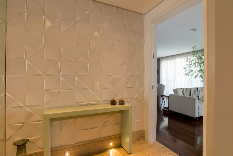 3 No hall de entrada deste apartamento, a arquiteta escolheu o revestimento 3D, que também marca presença em algumas paredes da área social | Foto: Edson Ferreira