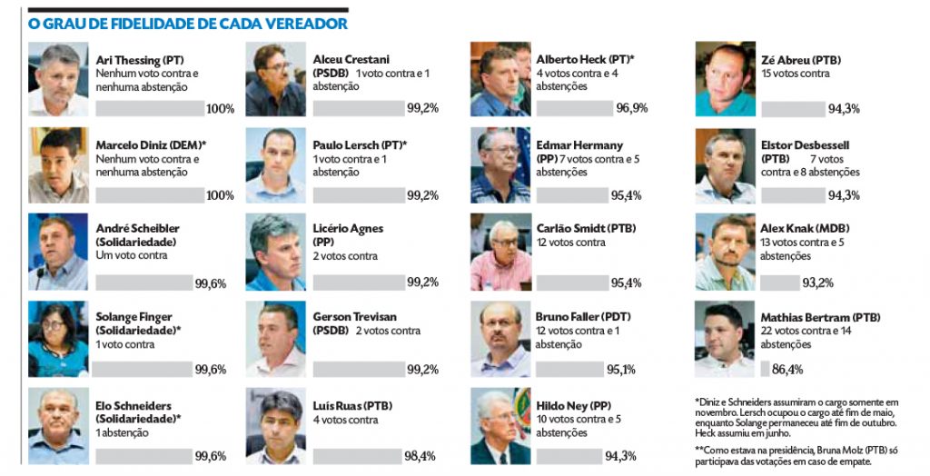 Com base em informações do site da Câmara, a reportagem analisou os resultados das votações de 266 propostas encaminhadas pela Prefeitura em 2019, incluindo 221 projetos de lei, 28 projetos de lei complementar e 17 vetos. Thessing, que fez oposição a Telmo durante o primeiro mandato e irá se transferir para o Cidadania, partido que já assegurou apoio ao futuro candidato do prefeito, foi o único que não se opôs a nenhuma proposição do Executivo ao longo do ano. O atual líder de governo, Marcelo Diniz (DEM), também manteve-se 100% alinhado até agora, mas ele assumiu apenas em novembro. Já Bertram deu 22 votos contra Telmo e se absteve em 14 votações.