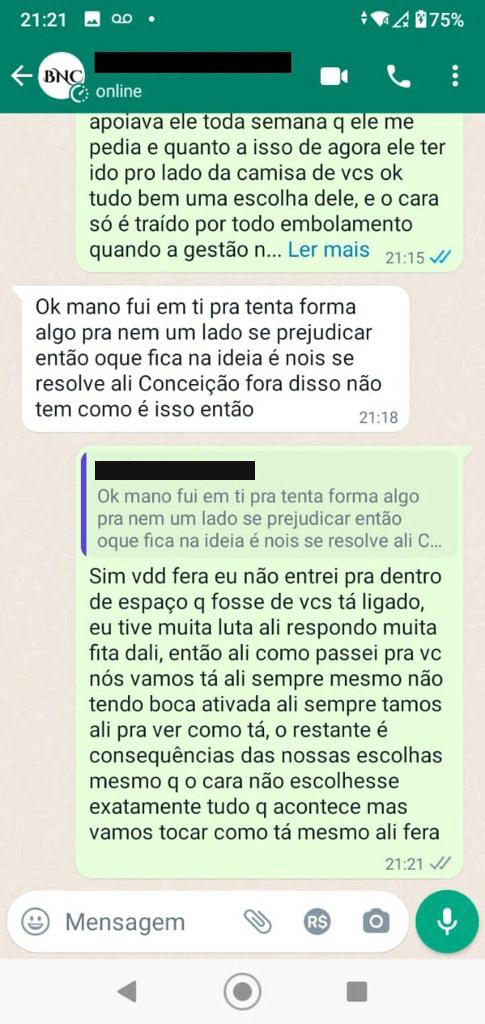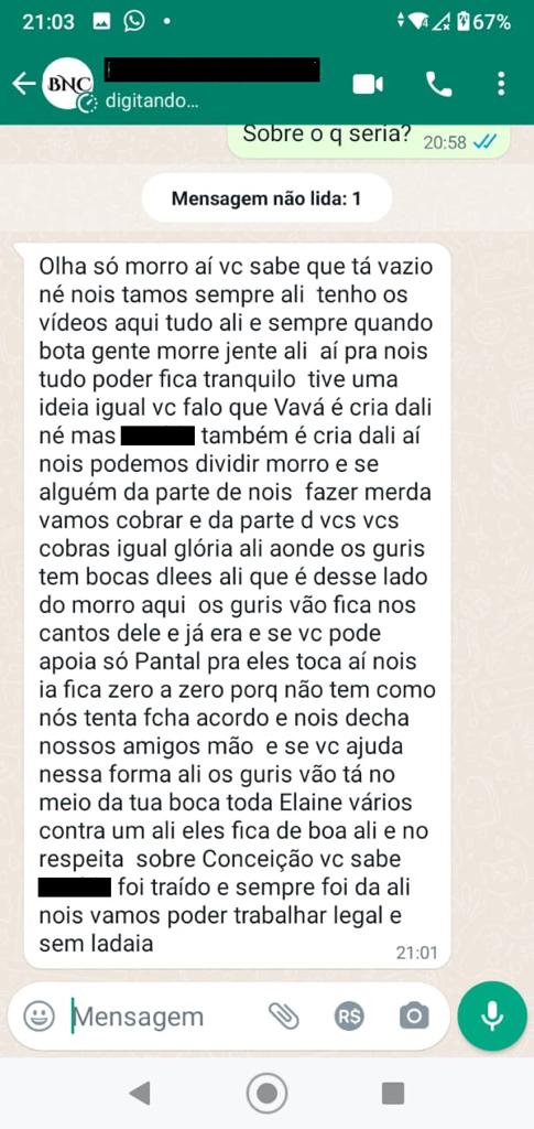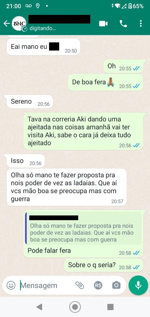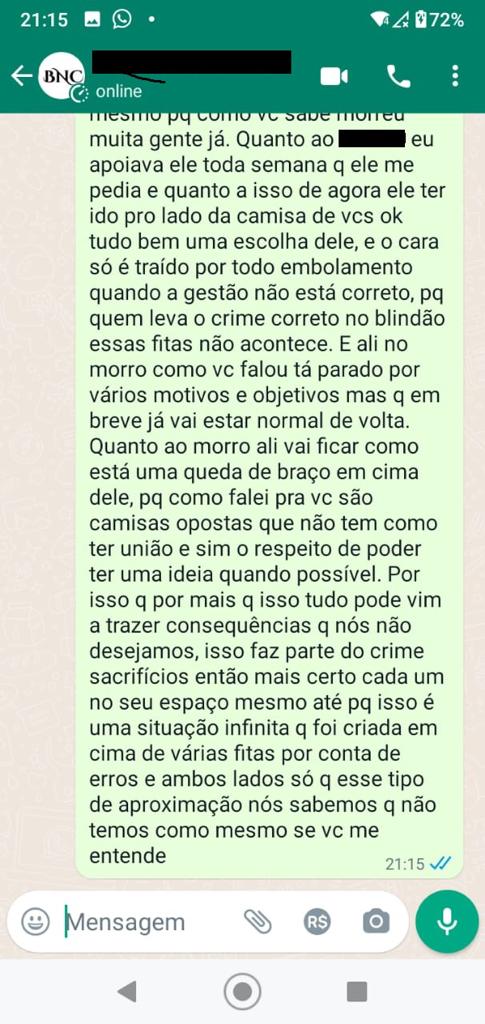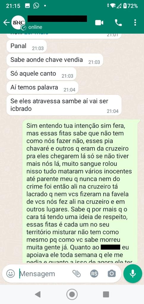 Na conversa, apurou-se que se trata da Vila Conceição e parte do bairro Santa Tereza, nas quais os indivíduos tentam decidir qual facção vai traficar em determinados pontos. Ao final, os indivíduos não chegam a nenhum acordo e decidem continuar a disputa.