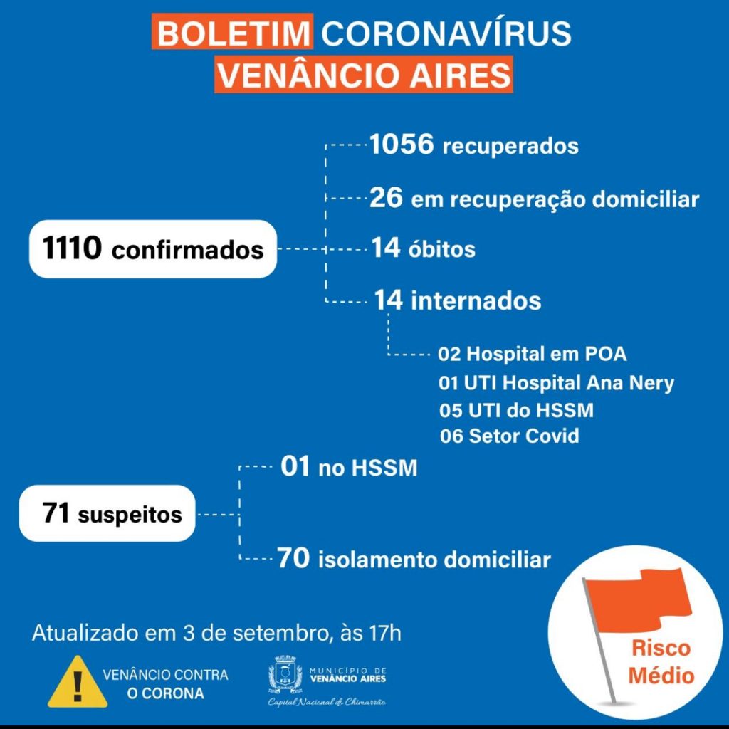 Este foi o 14º caso fatal de Covid-19 entre moradores de Venâncio Aires. Nesta quinta-feira, 3, também foram confirmados 26 novos casos da doença. O total de testes positivos no município chegou a 1.110. Os casos ativos são 40, com 26 pessoas em isolamento domiciliar e 14 hospitalizadas. A Secretaria Municipal da Saúde acompanha, ainda, 71 venâncio-airenses que aguardam resultado de exames.