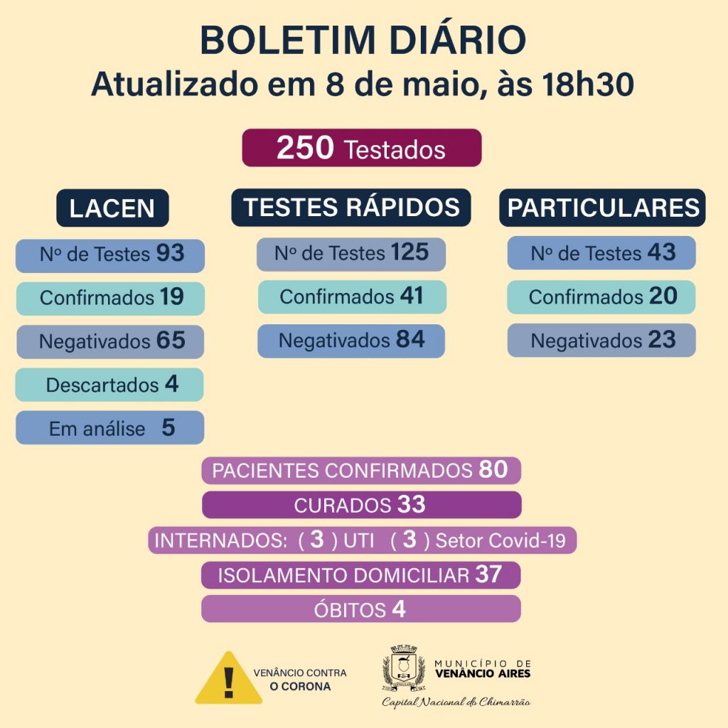 Até o fim da tarde desta sexta-feira, já foram testadas 250 pessoas em Venâncio. Das 81 que tiveram confirmação da doença, 33 já estão recuperadas, 38 estão em isolamento domiciliar, seis estão internados e quatro vieram a óbito.