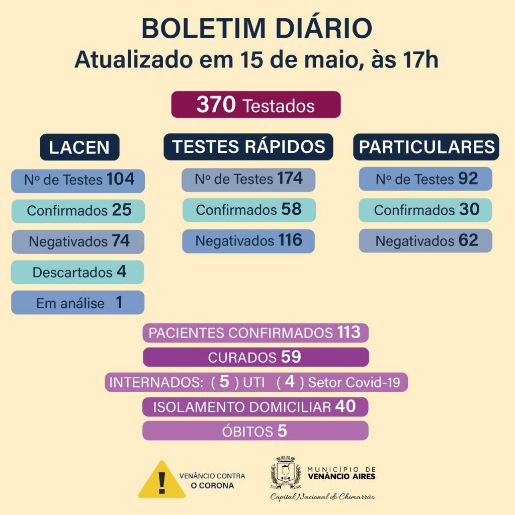 A Secretaria da Saúde de Venâncio Aires registrou nesta sexta-feira, 15, o quinto óbito por coronavírus. A vítima é uma mulher, de 78 anos, que estava internada na Unidade de Tratamento Intensivo (UTI) do Hospital São Sebastião Mártir (HSSM) desde o dia 24 de abril. Ela tinha histórico de doenças cardíacas.