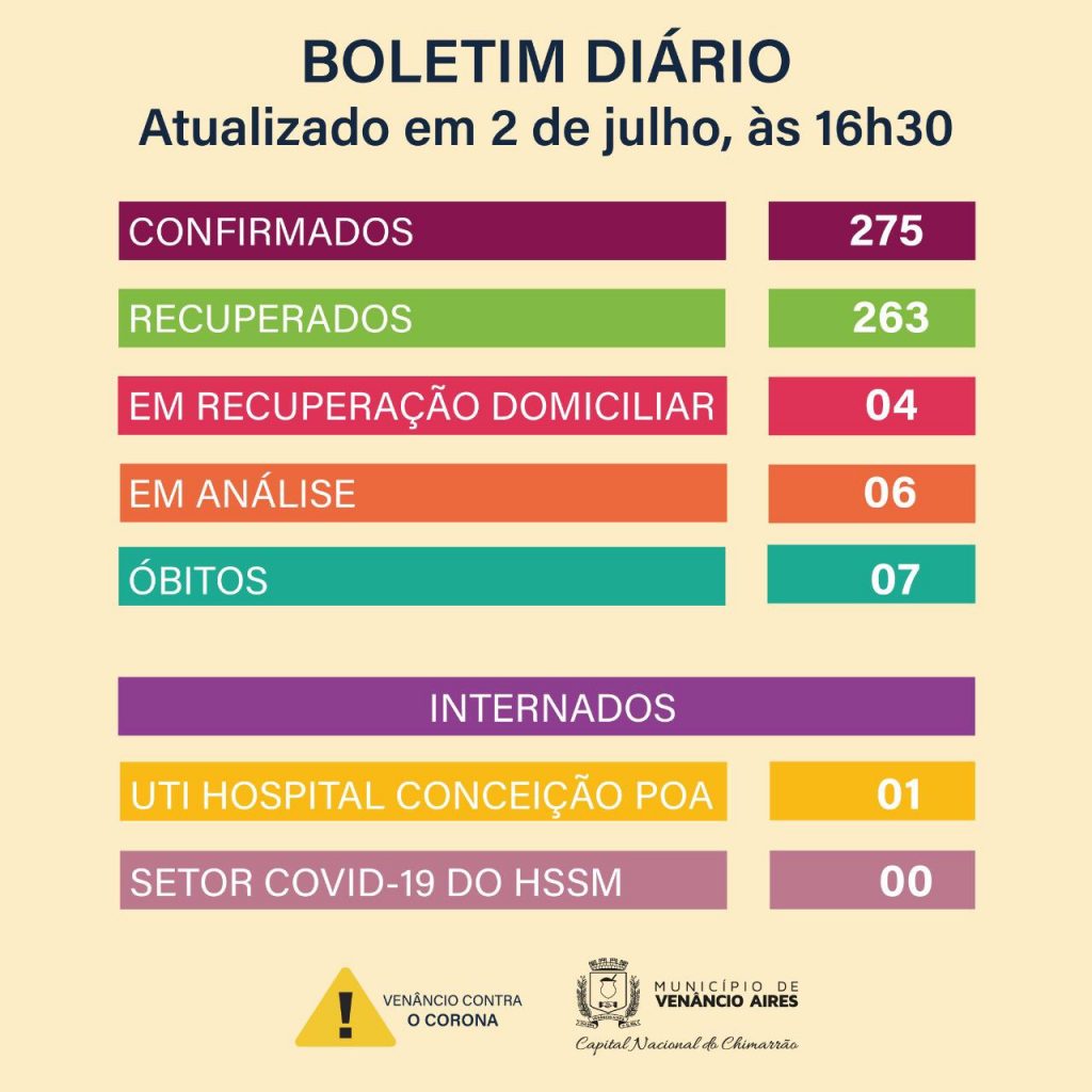 Venâncio Aires teve, até esta quinta, 275 testes positivos para infecção pelo novo coronavírus. No entanto, só cinco destes casos seguem ativos, com os pacientes ainda se recuperando. Quatro estão em isolamento domiciliar e um está internado, em um hospital de Porto Alegre. Outras 263 pessoas que tiveram confirmação da doença se recuperaram e sete faleceram.