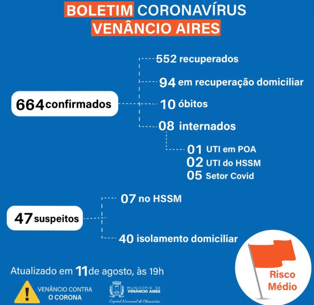 Venâncio Aires registrou 40 novos casos de coronavírus nesta terça-feira, 11. Agora, já são 664 venâncio-airenses que positivaram para a doença desde o início da pandemia. Do total de confirmados, 552 já são considerados recuperados. Neste momento 94 pessoas positivadas se recuperam em isolamento domiciliar. Outros oito pacientes estão internados por conta da doença.