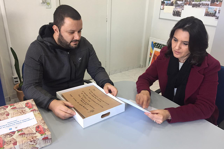Na última segunda-feira, 19, o professor do curso de Produção em Mídia Audiovisual da Unisc Diego Weigelt recebeu da secretária municipal de Educação, Jaqueline Marques, os mais de 40 textos produzidos no concurso Minha história dá um filme. Participam desta edição 15 escolas municipais de ensino fundamental. Na próxima quinta-feira, 22, será anunciado o texto vencedor.