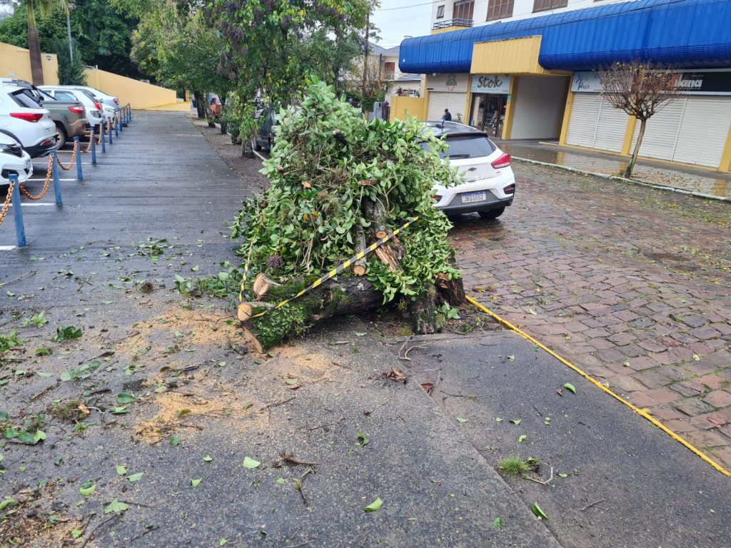 Na Rua Rio Branco, no Bairro Centro, uma árvore não resistiu à força do vento e acabou caindo e ficando suspensa sobre fios de rede elétrica. Segundo relato de um morador das proximidades, que preferiu não se identificar, a árvore sofria risco de queda há mais de um mês. A situação, segundo ele, já havia sido notificada junto à RGE.