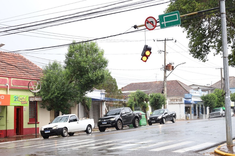 A chuva que chegou no início da tarde desta quinta-feira, 26, em Santa Cruz do Sul, acompanhada de vento forte, causou estragos em alguns pontos do município. A sinaleira localizada na esquina das ruas Carlos Trein e Capitão Fernando Tatsch caiu com a ventania e ficou presa apenas no fio elétrico.