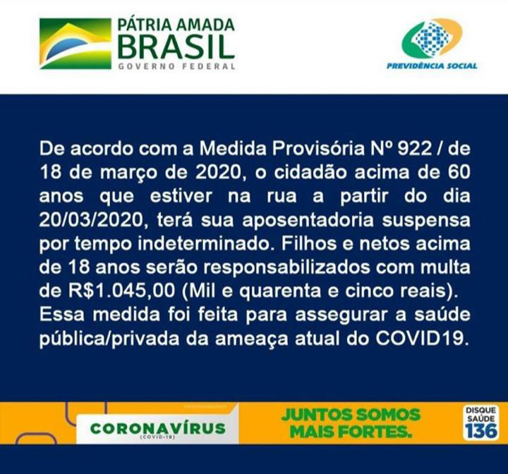 Circula pelas mídias sociais desde as últimas horas uma imagem na qual consta uma informação a respeito de uma suposta Medida Provisória, que teria sido editada na quarta-feira, 18, determinando que pessoas acima de 60 anos que estiverem na rua teriam a aposentadoria suspensa por tempo indeterminado. A imagem traz a identidade visual da Previdência Social, do governo federal e da campanha de combate ao coronavírus.