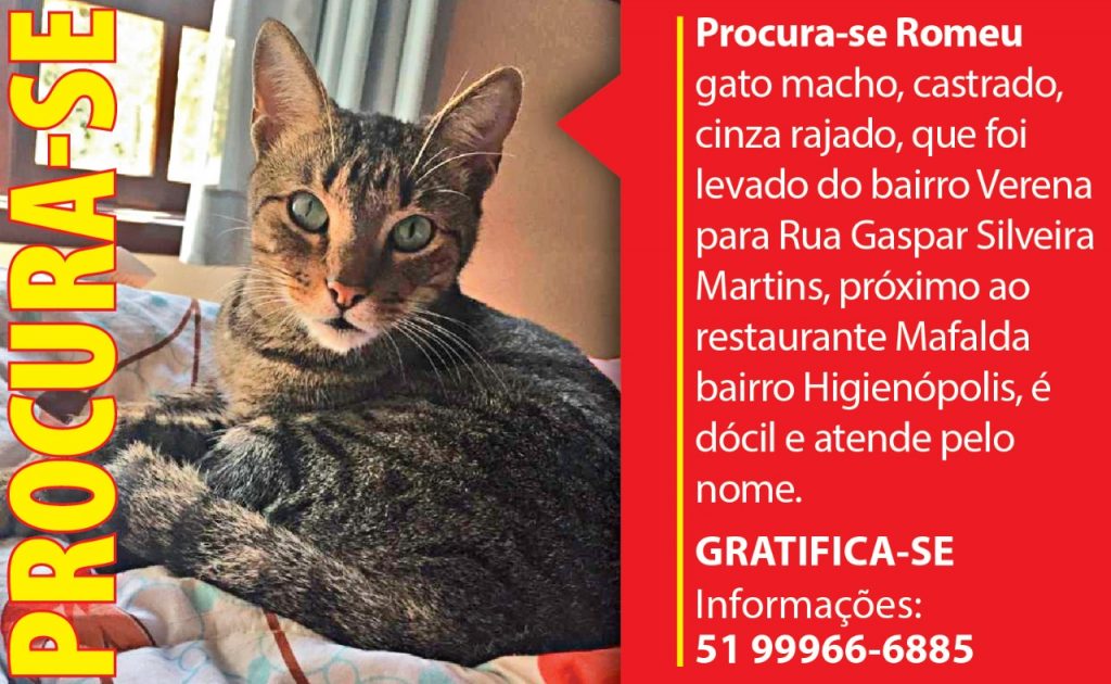 Romeu é um gato macho, castrado, dócil, de coloração cinza rajado e atende pelo nome. Ele tem cerca de seis anos e foi adotado, ainda filhote, por Mariana. Informações podem ser repassadas ao telefone/whats (51) 9 9966-6885. Um gratificação será dada para quem passar informações verdadeiras sobre o paradeiro do animal.