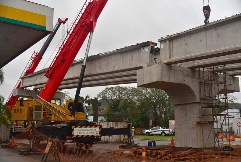 Ao longo do dia, mais oito unidades foram trazidas e posicionadas na estrutura. Desta forma, ao todo, o viaduto já está com 13 vigas colocadas devidamente em seus lugares – o projeto conta com um total de 20 delas. O transporte teve início no dia anterior, com a instalação das cinco primeiras vigas, em uma operação que envolveu quatro guindastes, caminhões de transporte e diversos utilitários de apoio.