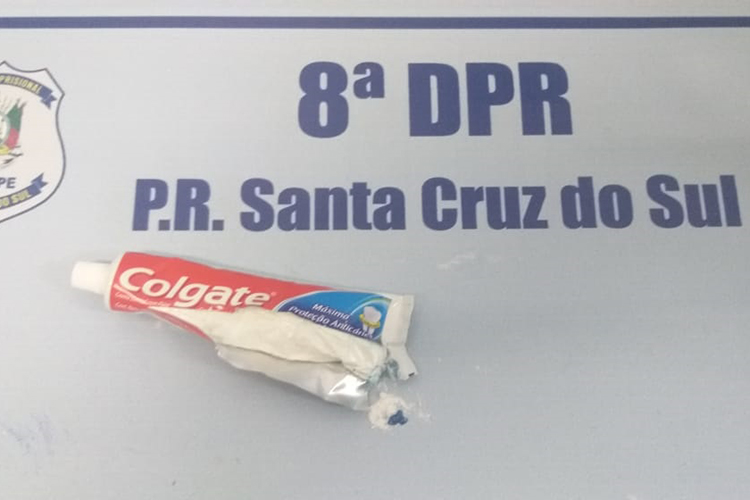 Agentes penitenciários do plantão e a equipe do Setor de Segurança e Disciplina do Presídio Regional de Santa Cruz do Sul apreenderam na manhã desta terça-feira, 14, 64 gramas de cocaína levada dentro de um tubo de pasta de dente. Em ação de combate à entrada de materiais ilícitos, a apreensão ocorreu no momento de revistas a alimentos e materiais de higiene pessoal que são entregues aos apenados enquanto os mesmos não estiverem recebendo visitas.