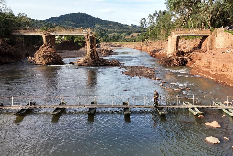 Na semana passada, eu e o Alan Toigo, meu colega da página Fumicultores do Brasil, estivemos em duas ocasiões em Sinimbu, para levar donativos que recebemos de produtores da região Sul do Estado. Fomos entregar esses itens a famílias, mas para isso tivemos de atravessar o Rio Pardinho em um barco. A foto acima mostra a pinguela improvisada na altura do Recanto Colonial Engelmann. Para quem presencia aquelas cenas, a situação é realmente dramática, e serão necessários muitos e muitos meses até que a rotina seja restabelecida com um mínimo de normalidade.