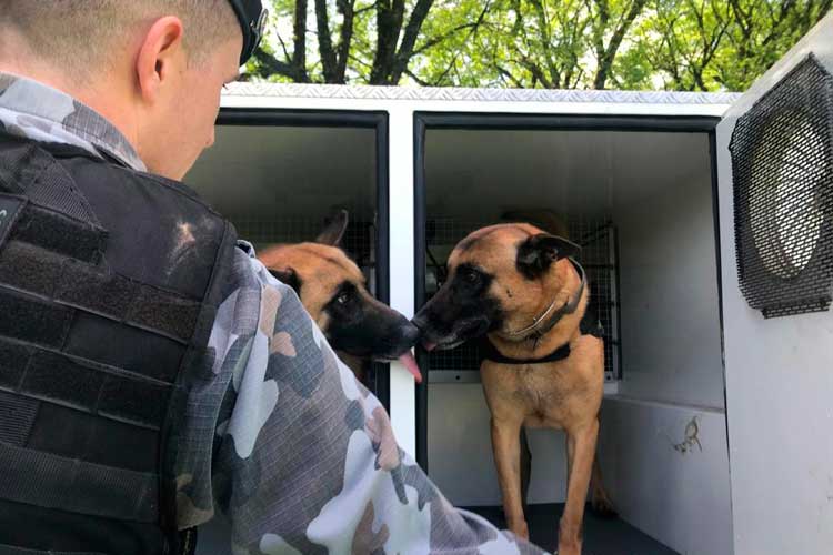 Para se deslocar pela região, seja para o treinamento ou atividades policiais, os cães contam com uma viatura adaptada. A Ford Ranger tem uma cachorreira climatizada e comporta até dois animais em gaiolas de transporte individuais. Além dela, a BM tem um reboque especial para quatro cachorros.