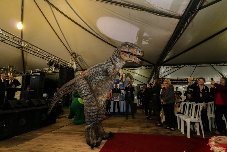 O DinoCeppo participou do lançamento da Expocande e foi convidado para permanecer em todos os dias da feira. “É interessante porque ele é muito realista e, além disso, traz um pouco da história da região.” Nessa quinta, o DinoCeppo foi recebido pelos mascotes da Expocande, Candino, Candina e Dino Jr.