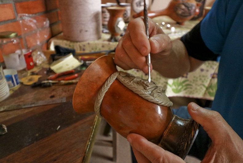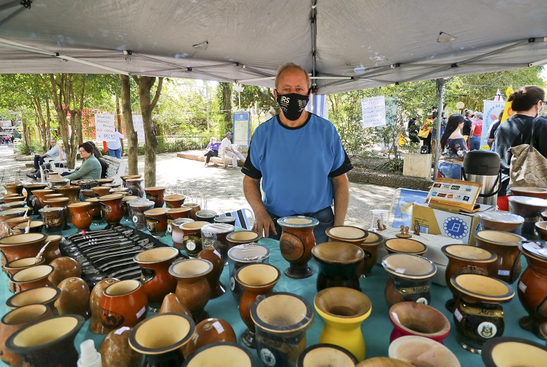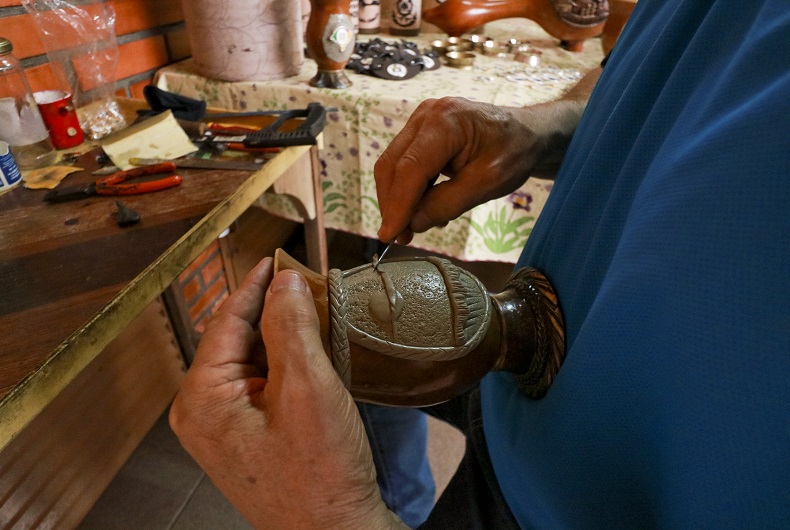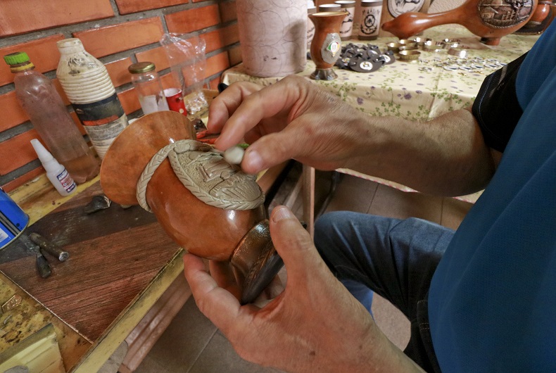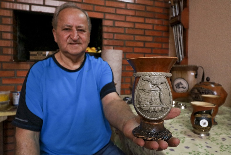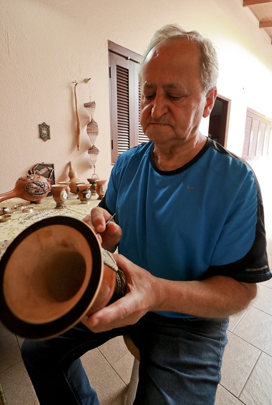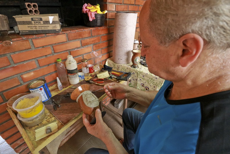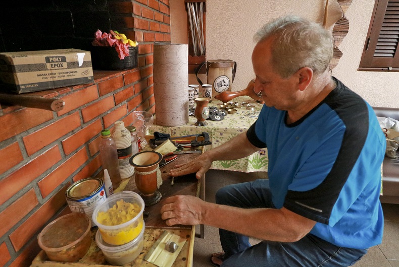 “Não pude mais trabalhar no serviço pesado. Eu tinha dois irmãos que faziam cuia, um em Porto Alegre e outro aqui. Aí eu falei: vou fazer isso. E eles riram de mim”, relembra. “Então comprei dez cuias e dez caixinhas de massa epóxi. Fiz aquelas dez e saí para vender. Como eu tinha saído da empresa, mas não fiquei inimigo do meu patrão, passei lá e ele comprou as dez. Aí voltei na loja e comprei mais 20 cuias, e assim fui indo”, relata. “Nunca fiz curso nenhum, só fui me atualizando com as tecnologias. Via meu irmão fazendo, aprendi vendo ele.”