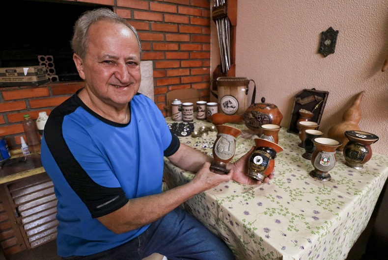 Com as novas tecnologias, o artesão foi se reinventando. Hoje, a massa que usa não contém amianto e não causa riscos à saúde. Além disso, as cuias que produz já contam com mais apetrechos, como bótons em metal, e nas vendas ele aceita pagamento por cartão e até Pix. “Se eu trabalhar o dia inteiro, faço umas 20 cuias, mas eu tenho outros afazeres também”, conta. Contudo, o gaúcho, além de fazer o objeto, também é um apreciador de chimarrão. “Tomo todos os dias, várias vezes por dia, de manhã, de tarde e de noite”, completa Octacilio.